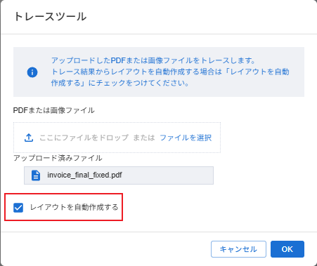 取り込むPDFファイルをアップロードファイルとして指定し、[ レイアウトを自動生成する ]にチェックを入れて [ OK ]をクリックする