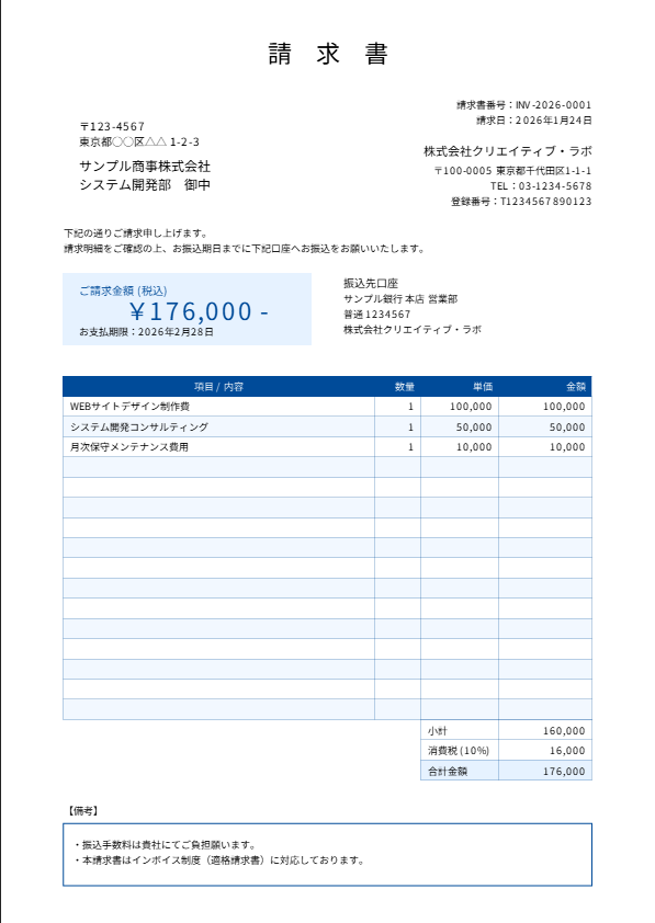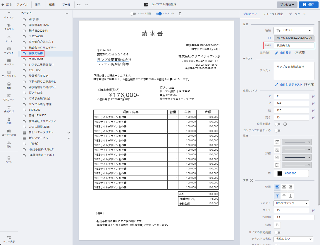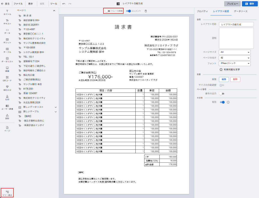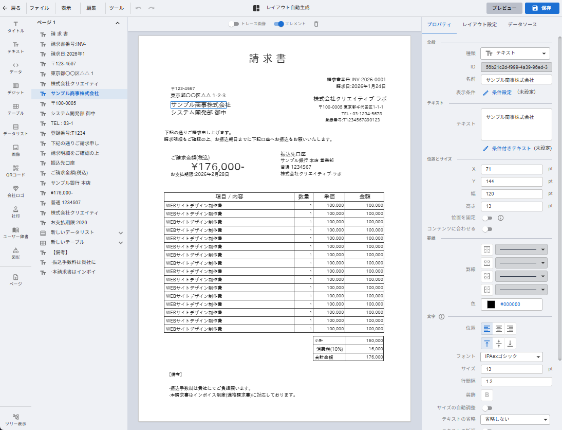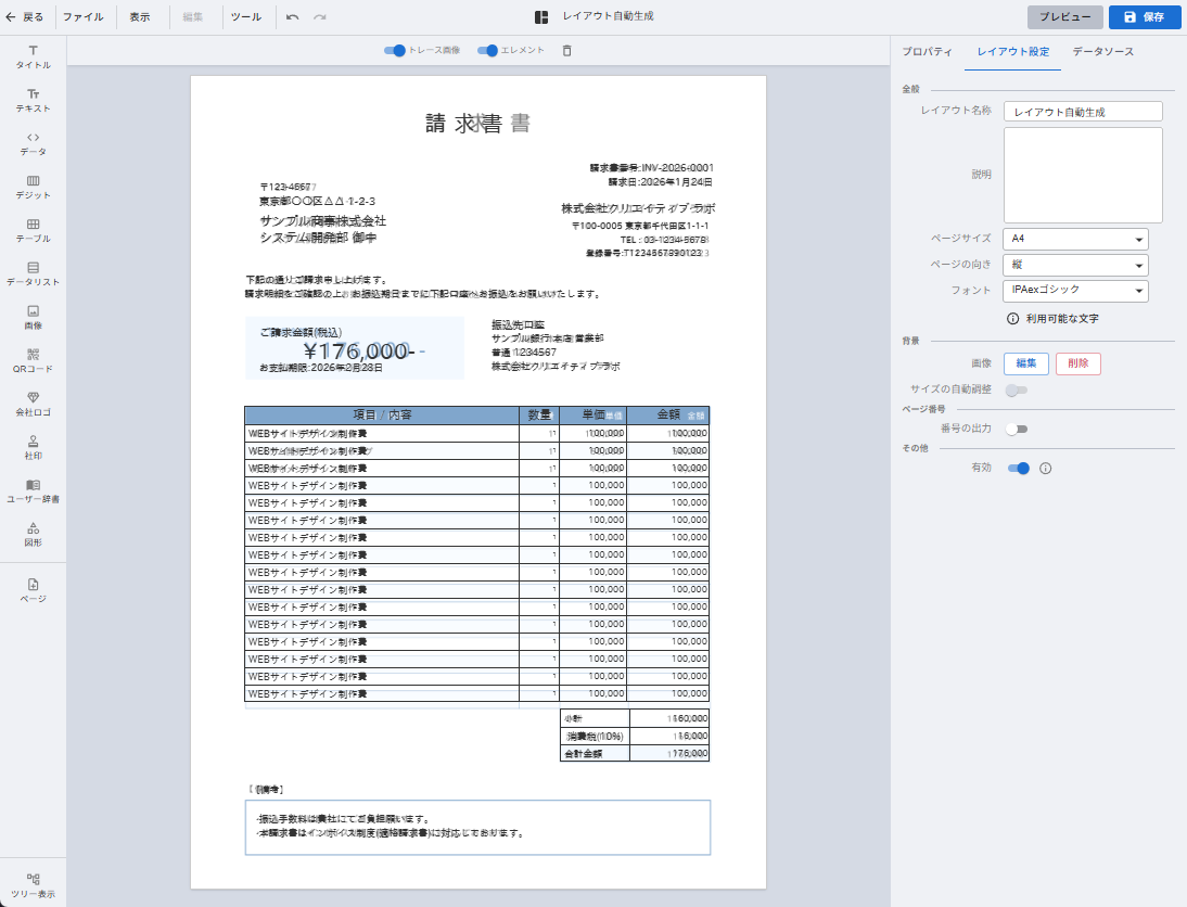 既存の請求書のPDFファイルを元に、自動作成機能を用いてレイアウトを作成する方法です。