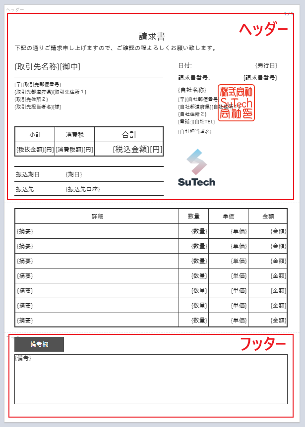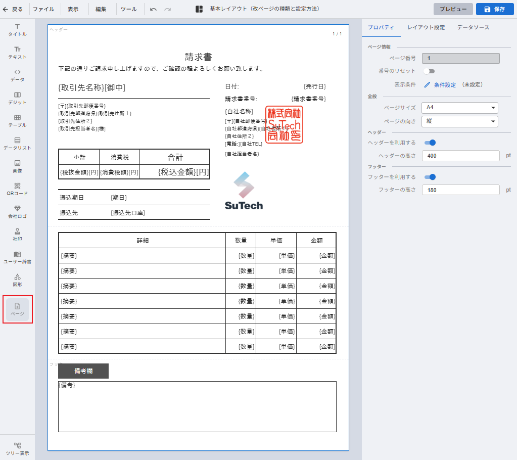 複数ページにまたがる場合、鑑にあたるヘッダー部など帳票の一部を繰り返し表示させることが可能です。