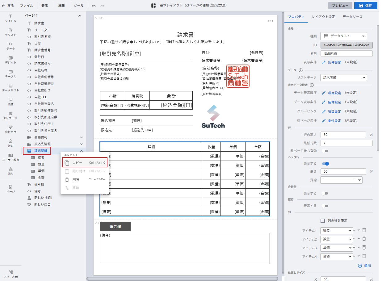 2. 1ページ目の明細のデータリストを選択し「コピー(Ctrl + Alt + C)」をクリック。