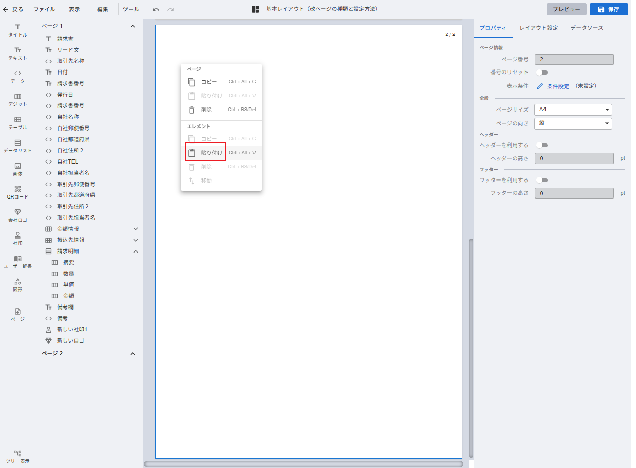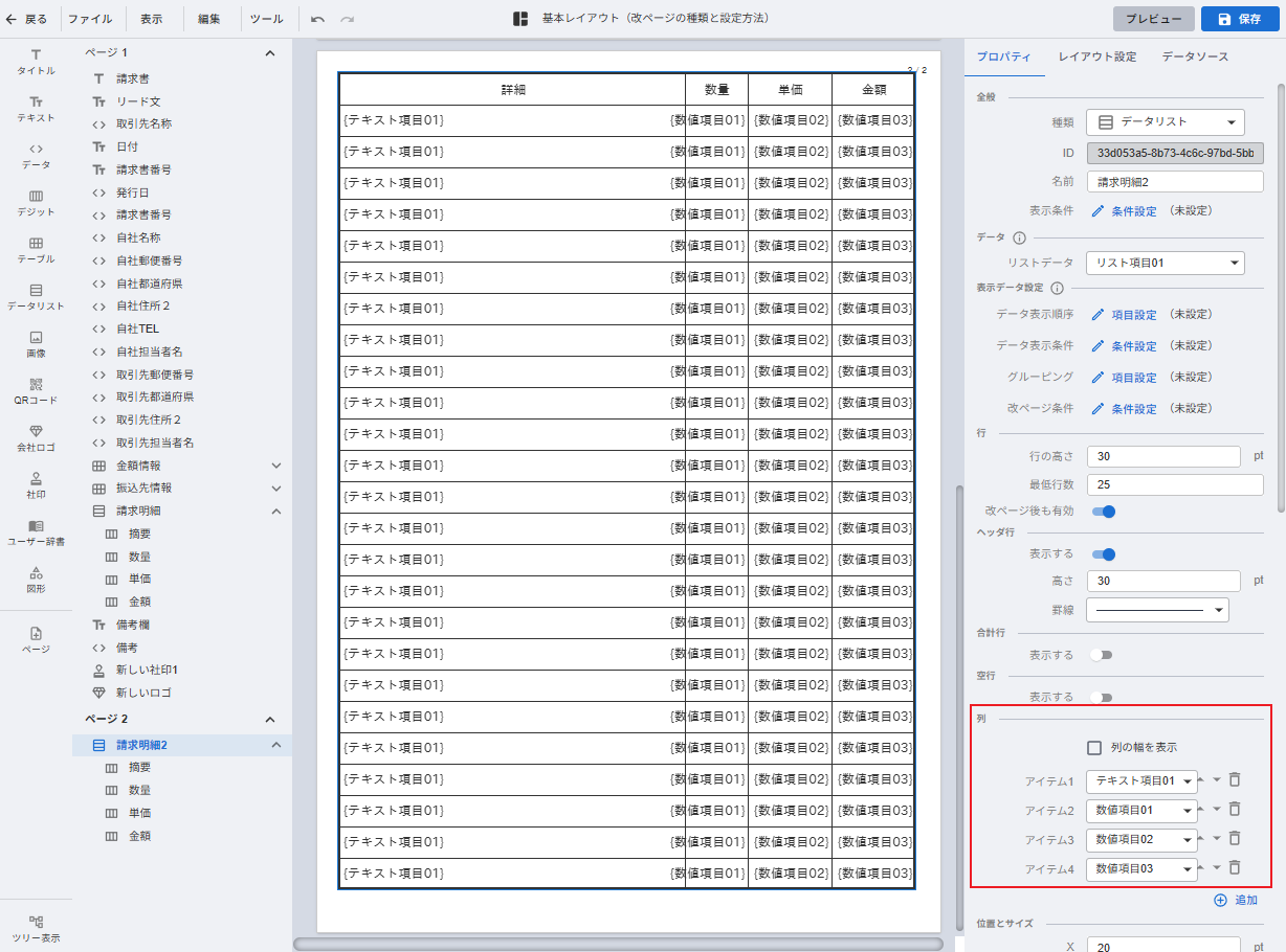 ここでは2ページ目のデータリストの名前を「請求明細2」、リストデータを「リスト項目01」として説明します