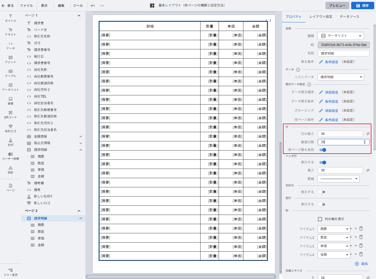 5. 2ページ目のデータリストの[行 > 最低行数]をページに合わせて調整。
