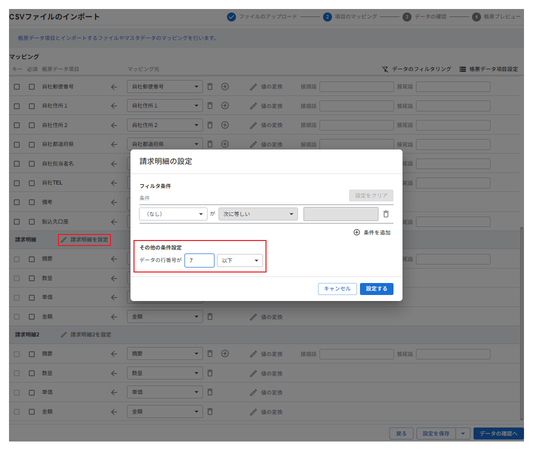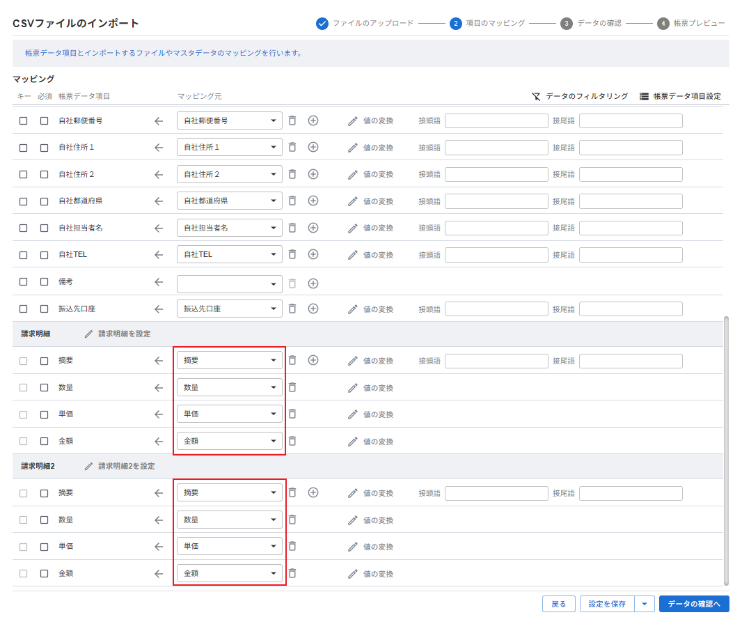 1. [CSVファイルのインポート > マッピング]で2つの請求明細に同じ項目をマッピングする。