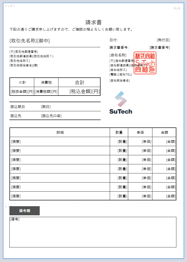 明細データが少ない場合は、以下のように帳票は1ページで出力されます。
